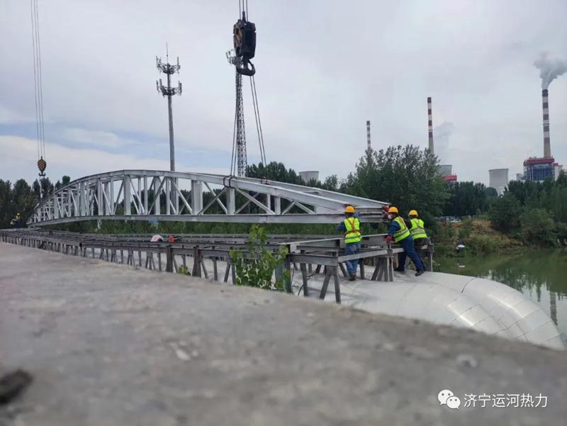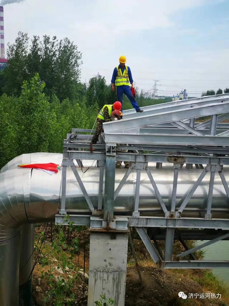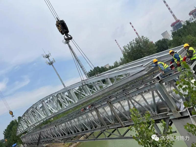隨著指揮員的一聲哨響,2022年6月14日11點19分,兩部碩大的吊車緩緩放下鋼索,跨度為51米的跨河供熱主管網(wǎng)加固支架順利吊裝完成,這標志著濟寧運河熱力有限公司的跨河DN1200的供熱主管網(wǎng)的安全隱患徹底消除,同時也為濟寧內(nèi)陸主城港區(qū)航道的升級改造掃除了卡脖子工程。