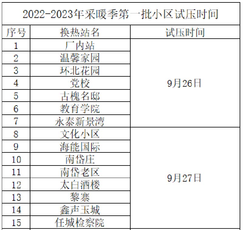 為確保供熱管網(wǎng)安全運行,供熱主管網(wǎng)注水試壓工作已于8月20日啟動,供熱系統(tǒng)現(xiàn)已整體具備試壓條件。各小區(qū)的供熱試壓工作將根據(jù)實際情況于9月26日相繼開展。試壓期間個別小區(qū)如因疫情影響不能正常進行的,我公司將以公眾號形式另行通知試壓時間。請廣大用戶及時關(guān)注我公司微信公眾號,留意公眾號發(fā)布的信息。同時我公司也將及時與各小區(qū)物業(yè)公司聯(lián)系,確定小區(qū)具體試壓時間,請廣大用戶及時與小區(qū)物業(yè)聯(lián)系或留意物業(yè)公司發(fā)布的相關(guān)信息。